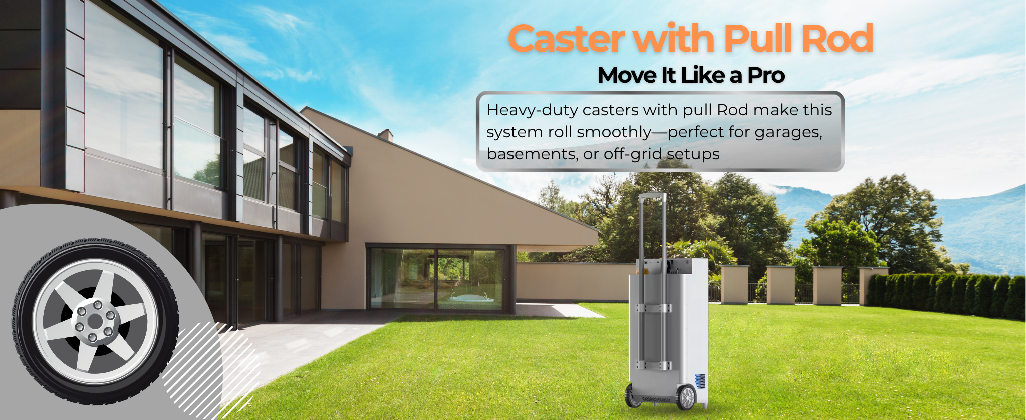 🛄 Effortless Portability – Retractable handle and 360° swivel wheels make moving the system as easy as pulling a suitcase, perfect for flexible installation.