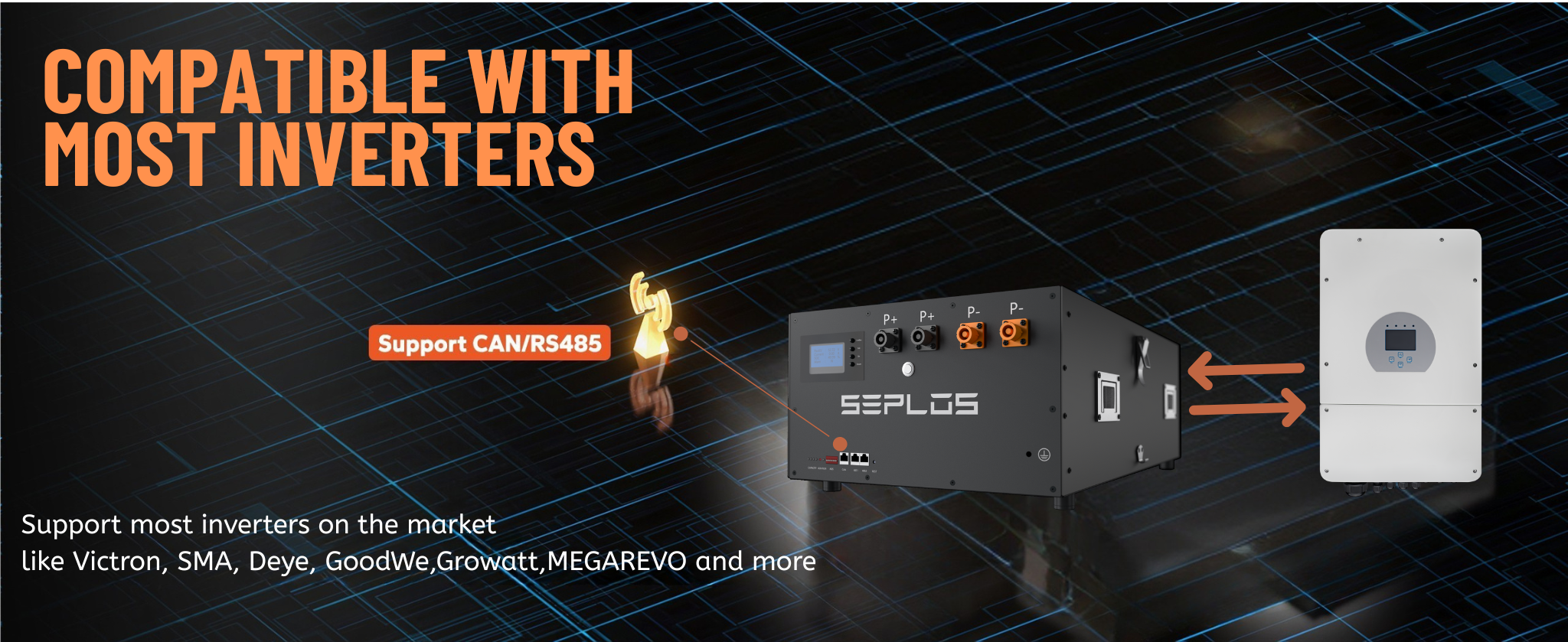 The Mason 280 LiFePO4 batteries have higher compatibility, which support CAN/RS485 and can communicate with popular all-in-one solar inverter chargers on the market, such as the Victron, SMA, DEYE, GoodWe and Growatt brands.