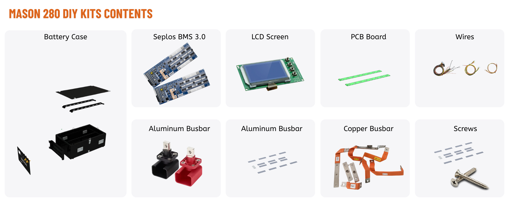 Take control of your energy future with the Seplos Mason 280 DIY Battery Kit—the most complete LiFePO4 bundle for home solar storage, off-grid living, and energy startups. Everything included: from high-current busbars to mounting hardware!